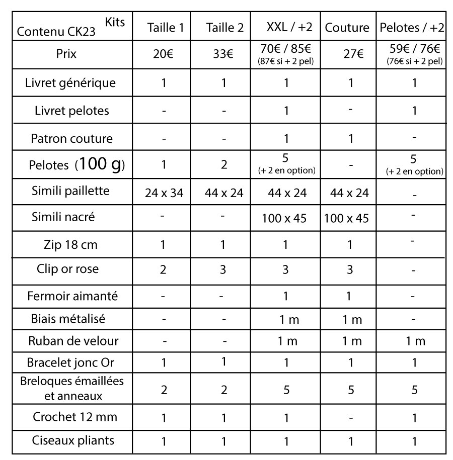 Et voici le tableau des kit Noël CK23 qui récapitule les contenus par taille de kit :