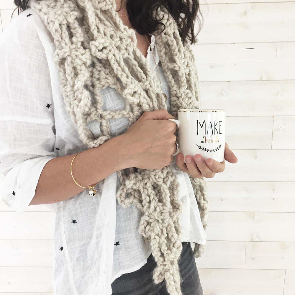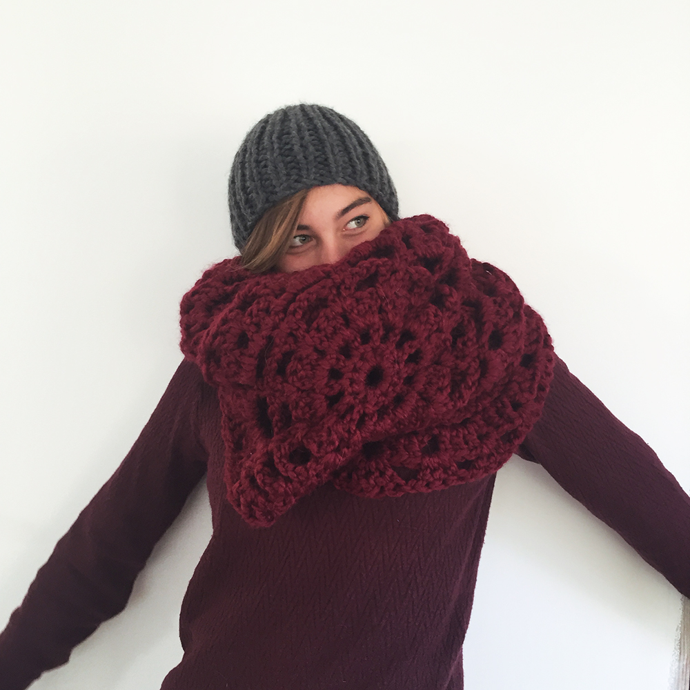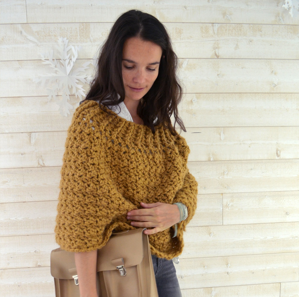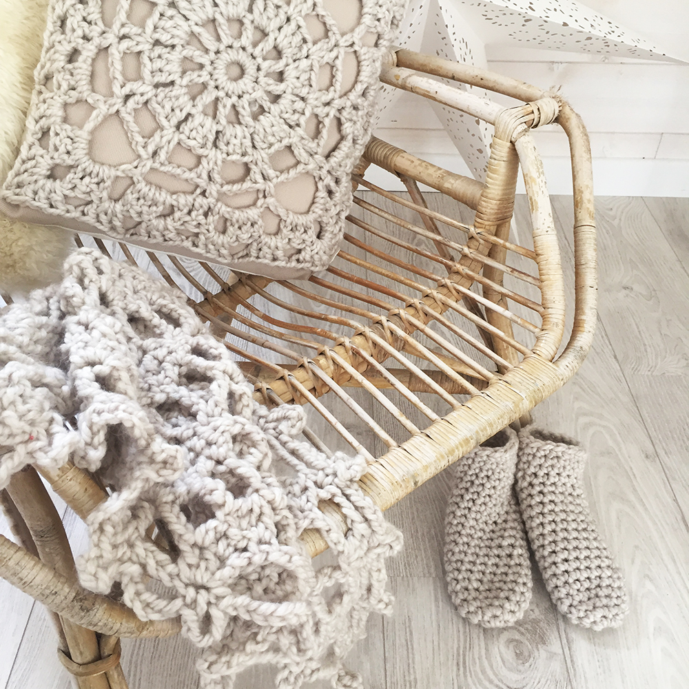 Cette saison nous avons été inspirées par toutes ces images de “Giant-crochet” ou “Oversize-knitting” alors ce fil, sans être dans l’excès en taille, est l’occasion d’entreprendre des projets très graphiques : coussin, plaid (ou “écharpe-couverture”) très “déco”, maxi-maxi pointe… des réalisations modernes, rapides et bluffantes !