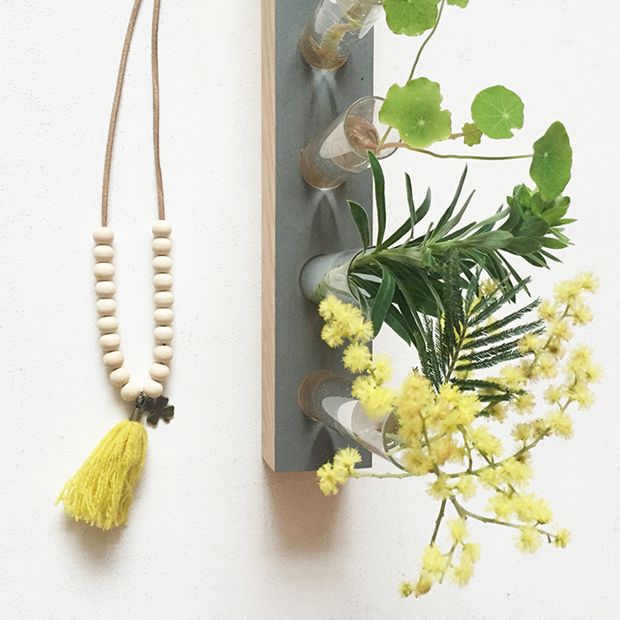 ZUKU, pelote jaune, damassé gris foncé, perles bois naturel et triangles bronze