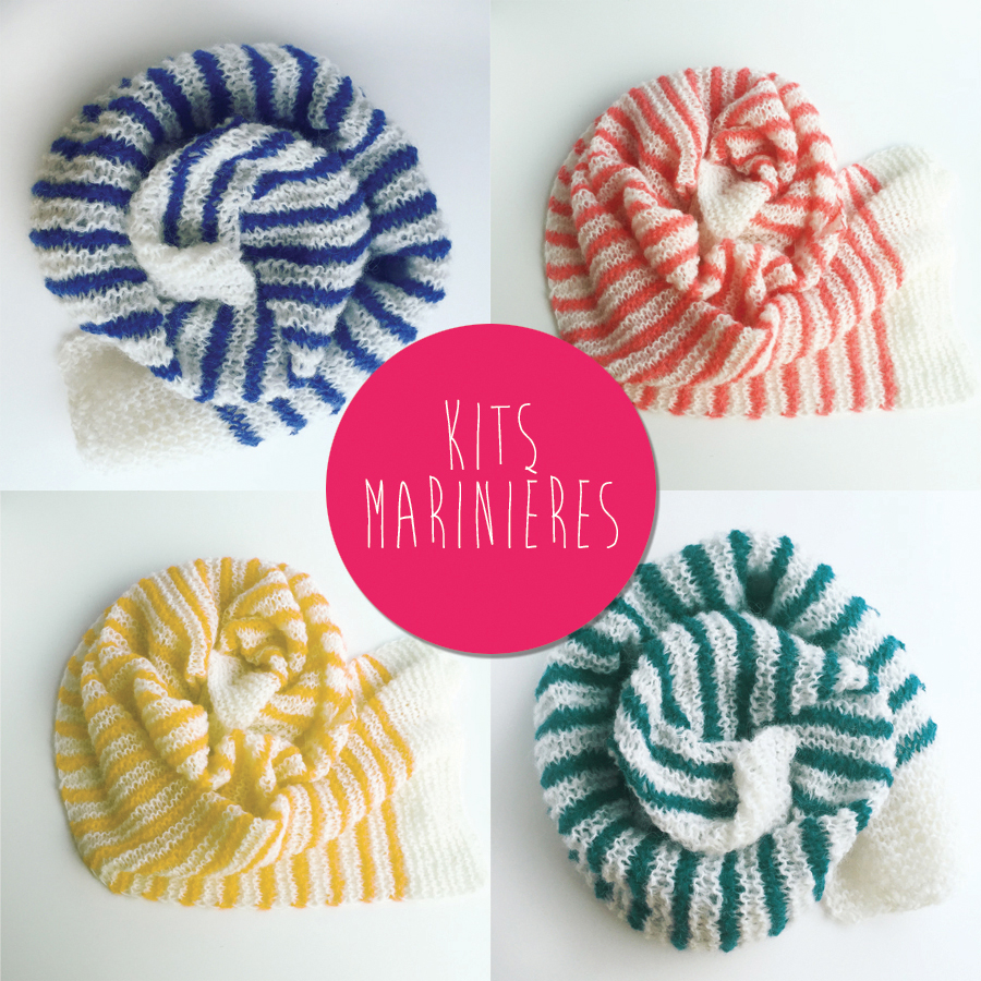 Pour cette édition, les kits Marinières et les kits Radieux comportent 6 pelotes d’alpaga de 199 m, des aiguilles circulaires n°8, (pas de crochet cette fois) et un livret commun. Ce livret contient les explications de 3 modèles en 2 techniques (5 possibilités donc) :