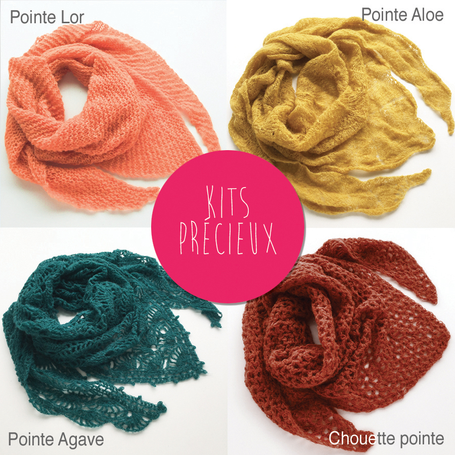 Nous avons mis dans ces nouveaux kits, un fil de très grande qualité, d’une douceur et d’une légèreté incroyable (que certaines ont déjà testé l’été dernier). Les pointes et étoles tricotées ou crochetées avec les 6 pelotes de ce merveilleux alpaga sont grandes (en fonction de votre main et de la technique, de 50 à 60 cm de large et de 145 à 160 cm de long) et parfaites pour réchauffer les épaules les soirs d’été et se blottir dedans à la rentrée, le plus gros problème est leur tendance à se faire “chipper” par les autres filles de la maison ;-))
