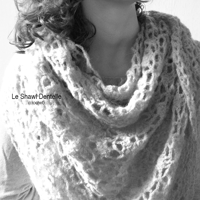 - le shall dentelle au crochet niveau expert (très enveloppant et très léger, effet dentelle ajourée) fil simple, crochet 5mm