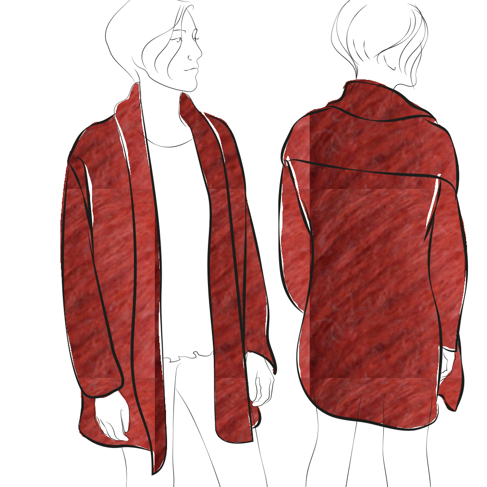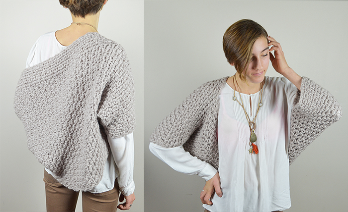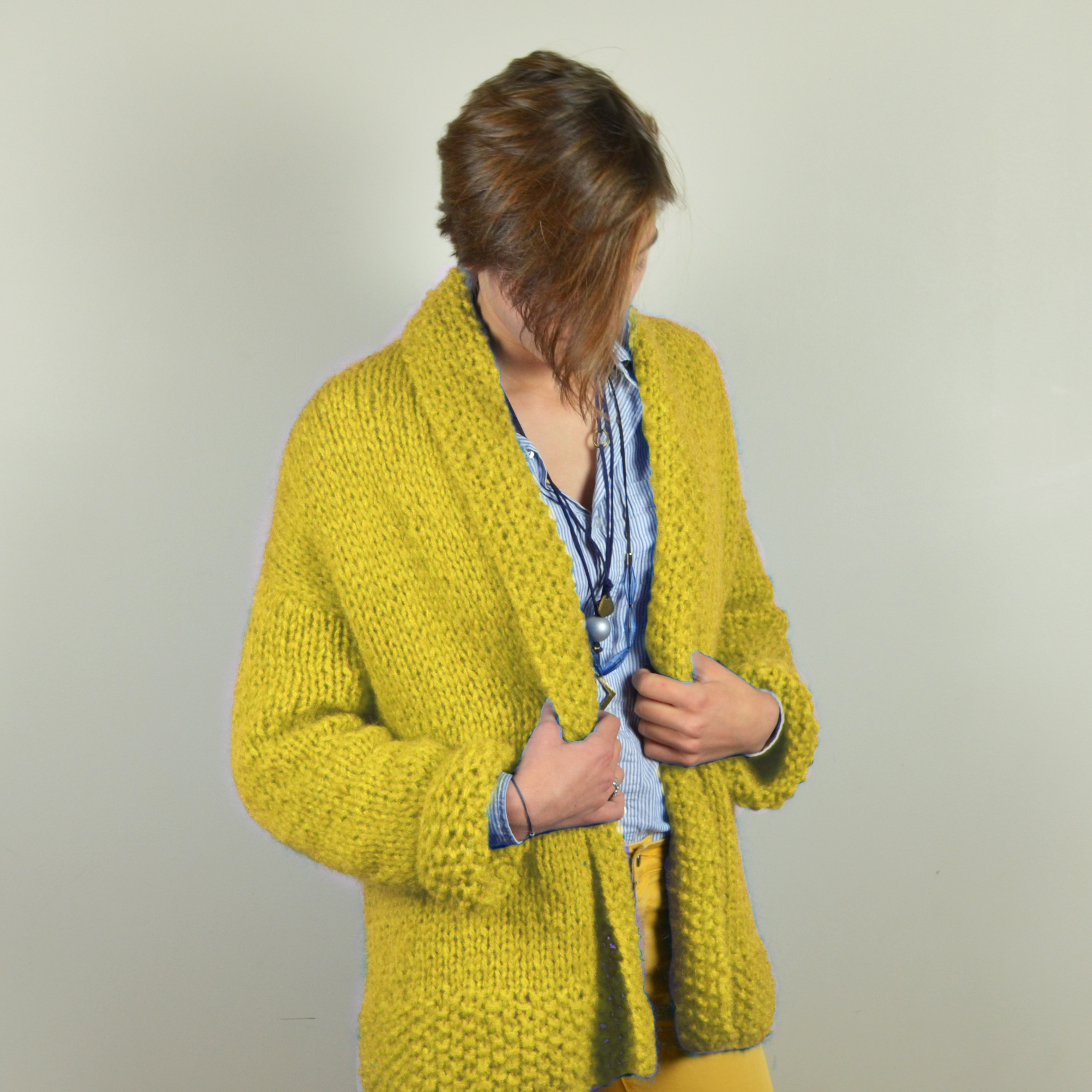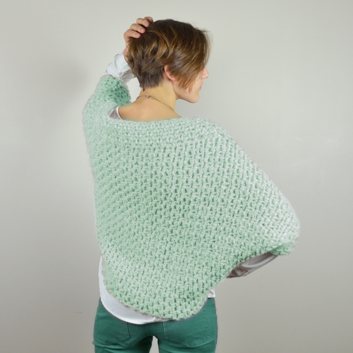 Pour celles qui le découvrent, ce modèle qui n’est pas un gilet et ne ferme pas devant peut donc être déroutant, il est inspiré du geste que l’ont fait assez vite quand on vit dès les premiers frimas avec un châle sur le dos, d’en nouer les pans par derrière pour qu’ils “ne trempent pas dans la sauce”.